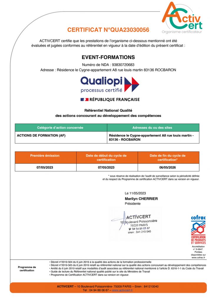 Qualiopi est comme un passeport qualité. Cela annonce notre processus formation est conforme aux exigences du référentiel national qualité. En effet, la marque Qualiopi nous confère légitimité et crédibilité sur le marché ultra concurrentiel des prestataires d’actions de développement des compétences.